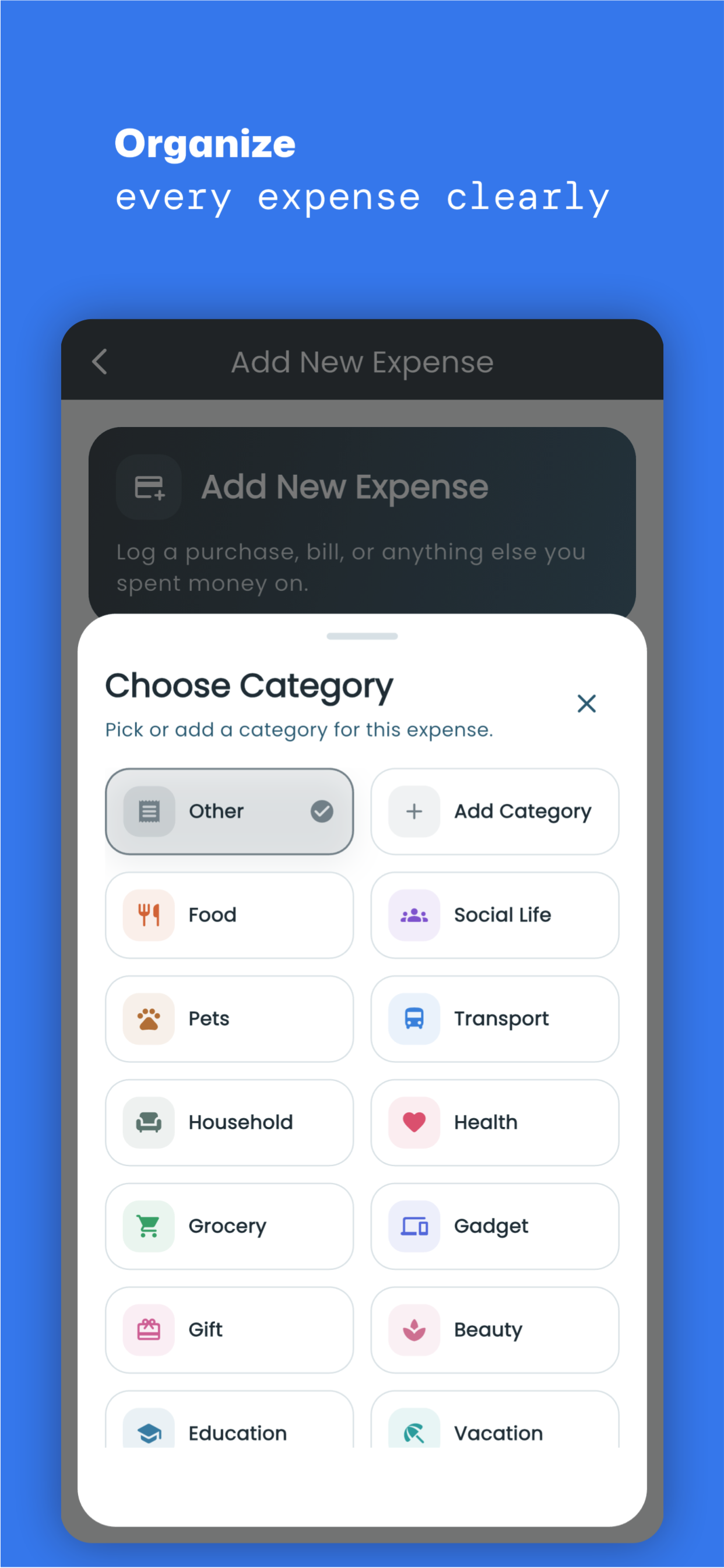 Category picking is straightforward, so each entry stays easy to understand when you review spending later.